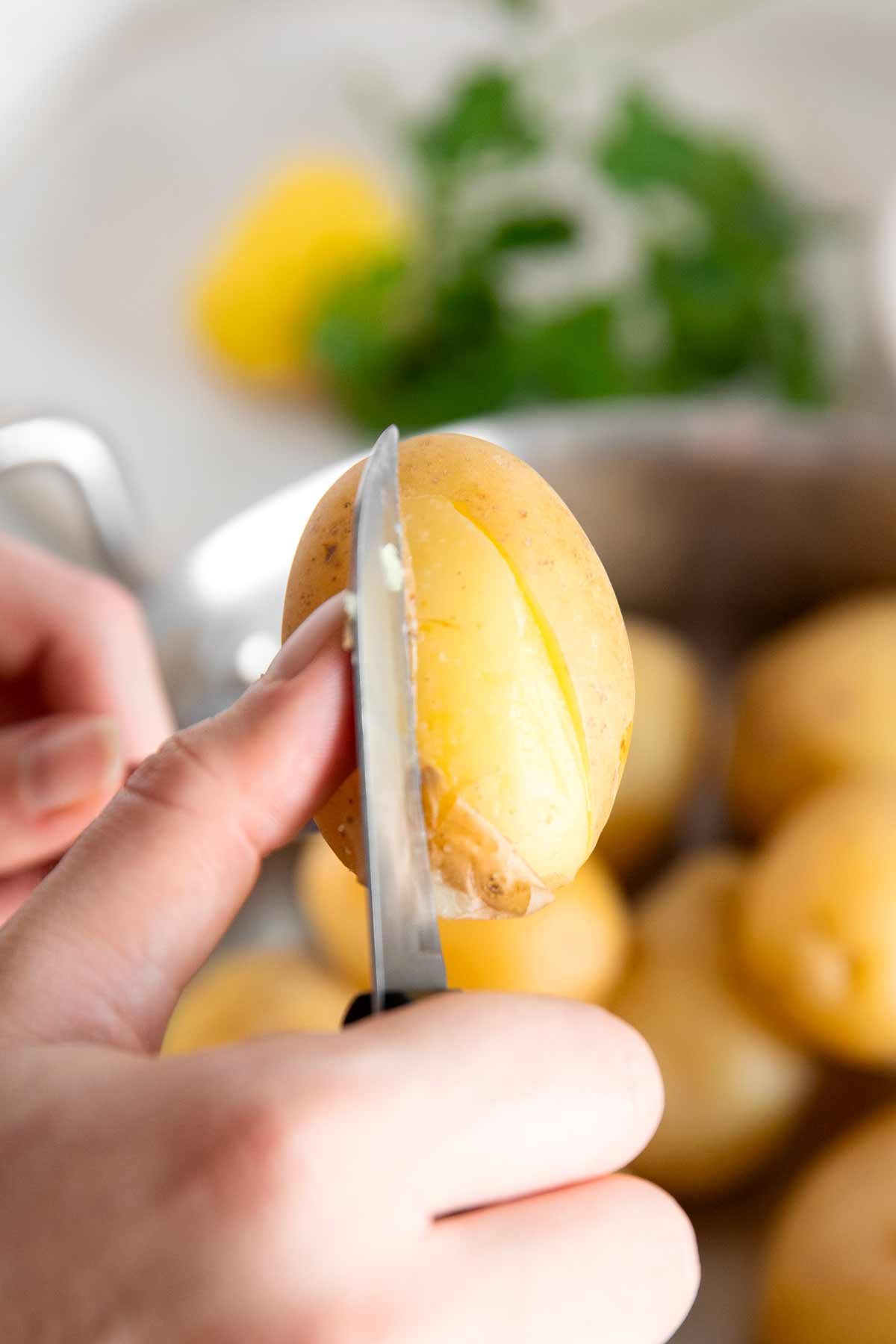 - Sobald das Wasser kocht, die Hitze reduzieren und die Kartoffeln halb abgedeckt oder ohne Deckel je nach Größe 20–40 Minuten köcheln lassen, bis sie mit einer Gabel leicht eingestochen werden können.